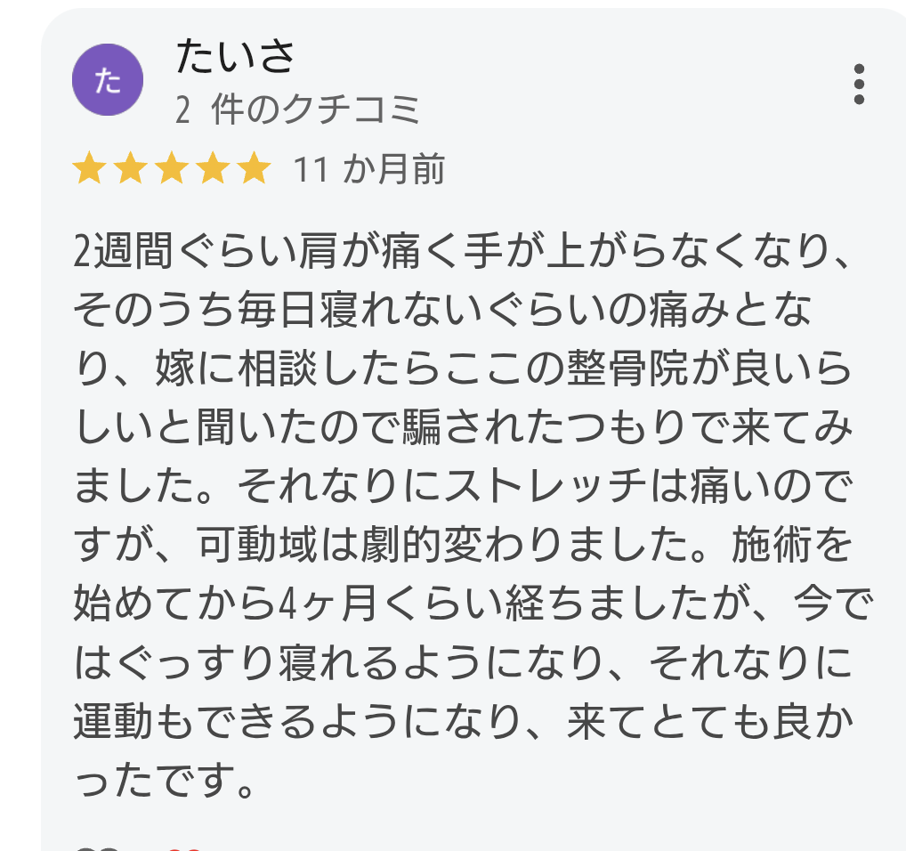 早めに対応できた為、拘縮が進まなかったと思われます。